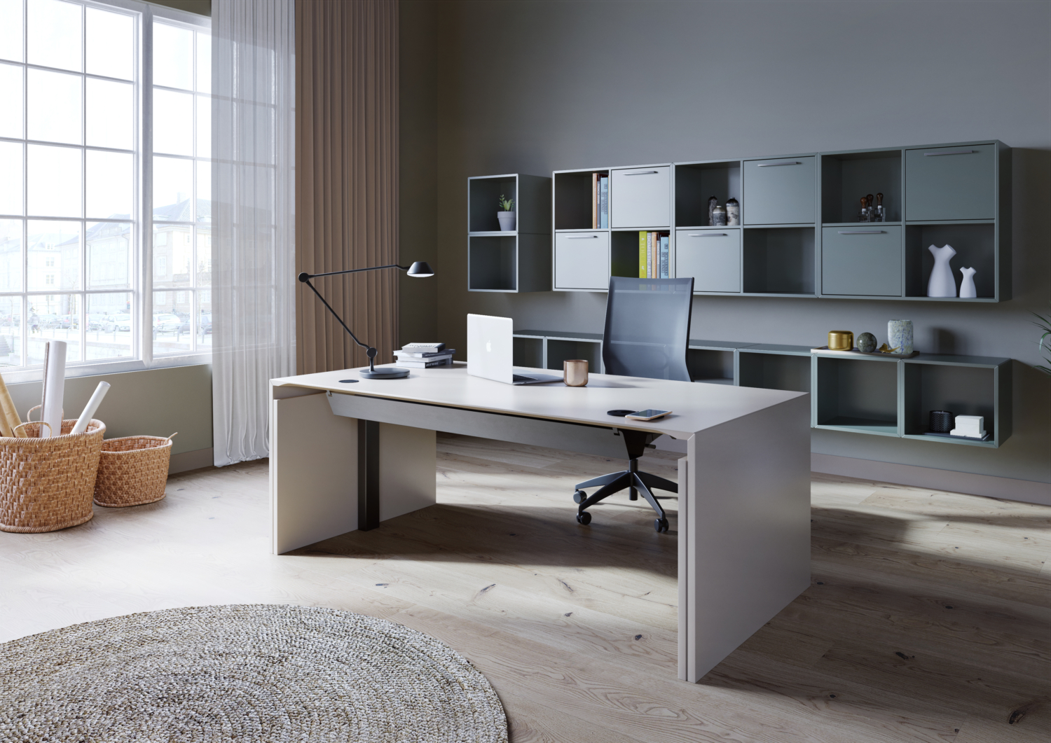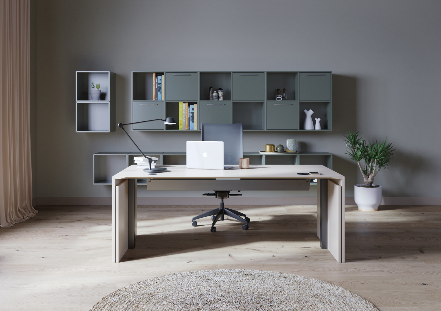 Du har mulighed for at tilpasse designet af skrivebordet efter dine ønsker ved at vælge mellem forskellige materialer til bordpladen, herunder finér, laminat, linomelym og nano laminat i flere forskellige farver. Bordpladen på skrivebordet er også udstyret med praktiske funktioner som kabelgennemføring og en kabelskjuler/kabelbakke under bordpladen for at opnå et skarpt og ryddeligt udseende.